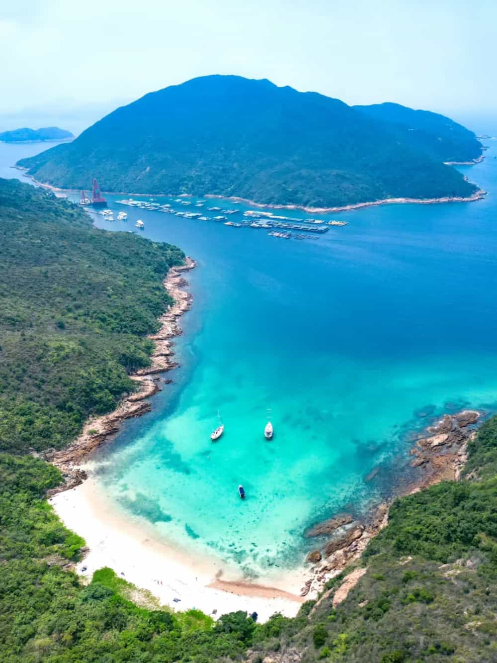 海湾全景:星罗小岛环抱一湾碧水,风平浪静如天然避风港🌅~澄澈海水倒映苍穹,日光碎金般洒落浪尖✨,珊瑚礁群若隐若现(请勿触碰哦!)🪸,水母精灵悠游起舞🪼,织就梦幻水下星空💫。远眺帆影点点,近听笑语逐浪——这里是都市外的自由乌托邦!