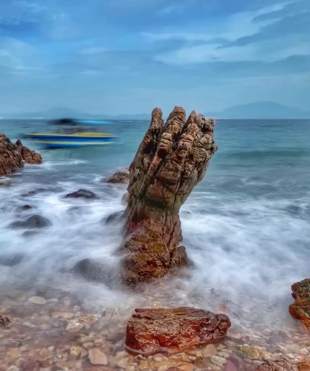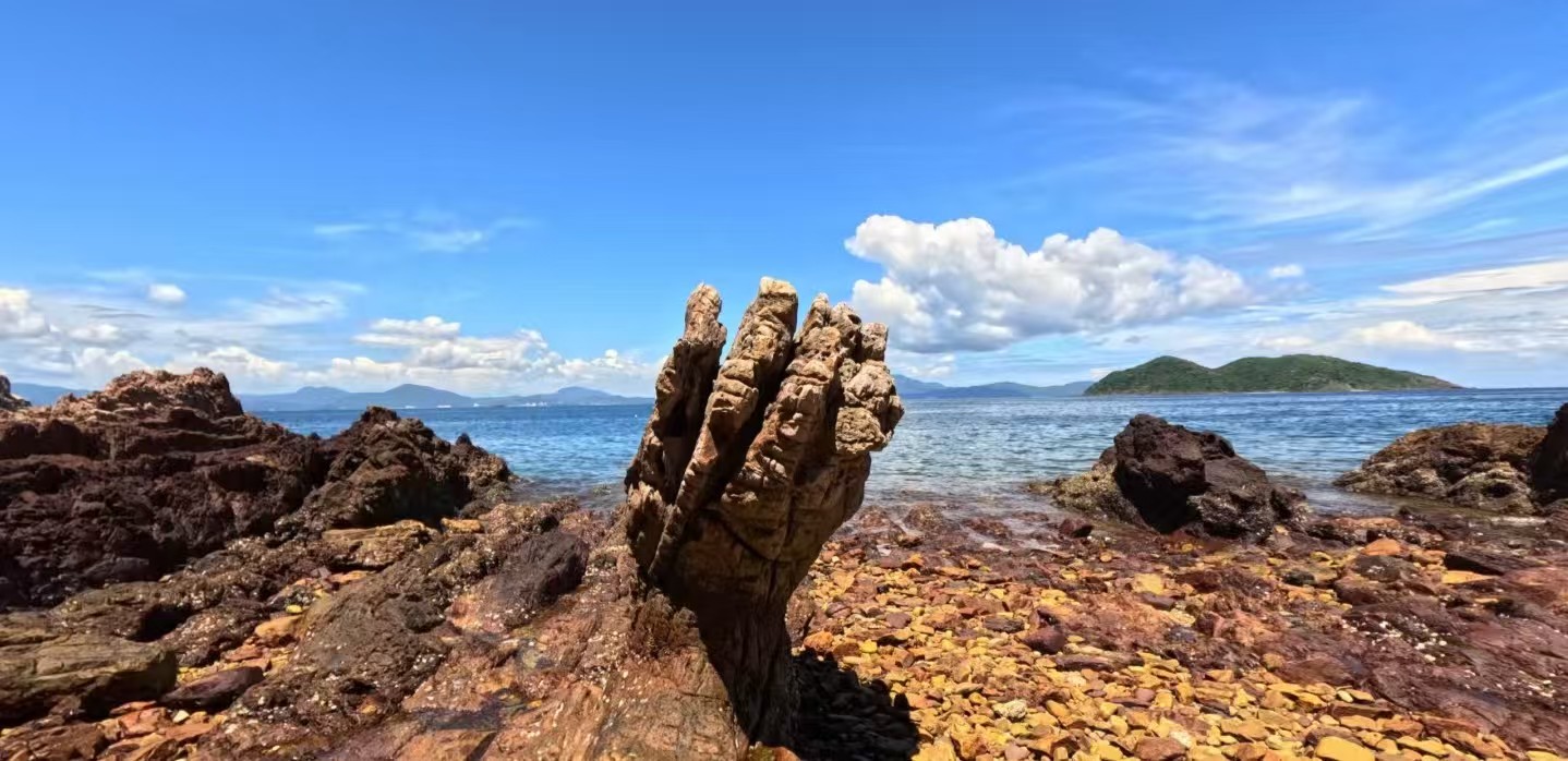 鬼手岩赫然矗立海角之巅,如同大地伸向苍穹的巨掌,4亿年风化雕琢的奇观让人惊叹自然鬼斧神工👻.触摸这香港最古老的岩石,仿佛听见泥盆纪的海浪在耳边回响。