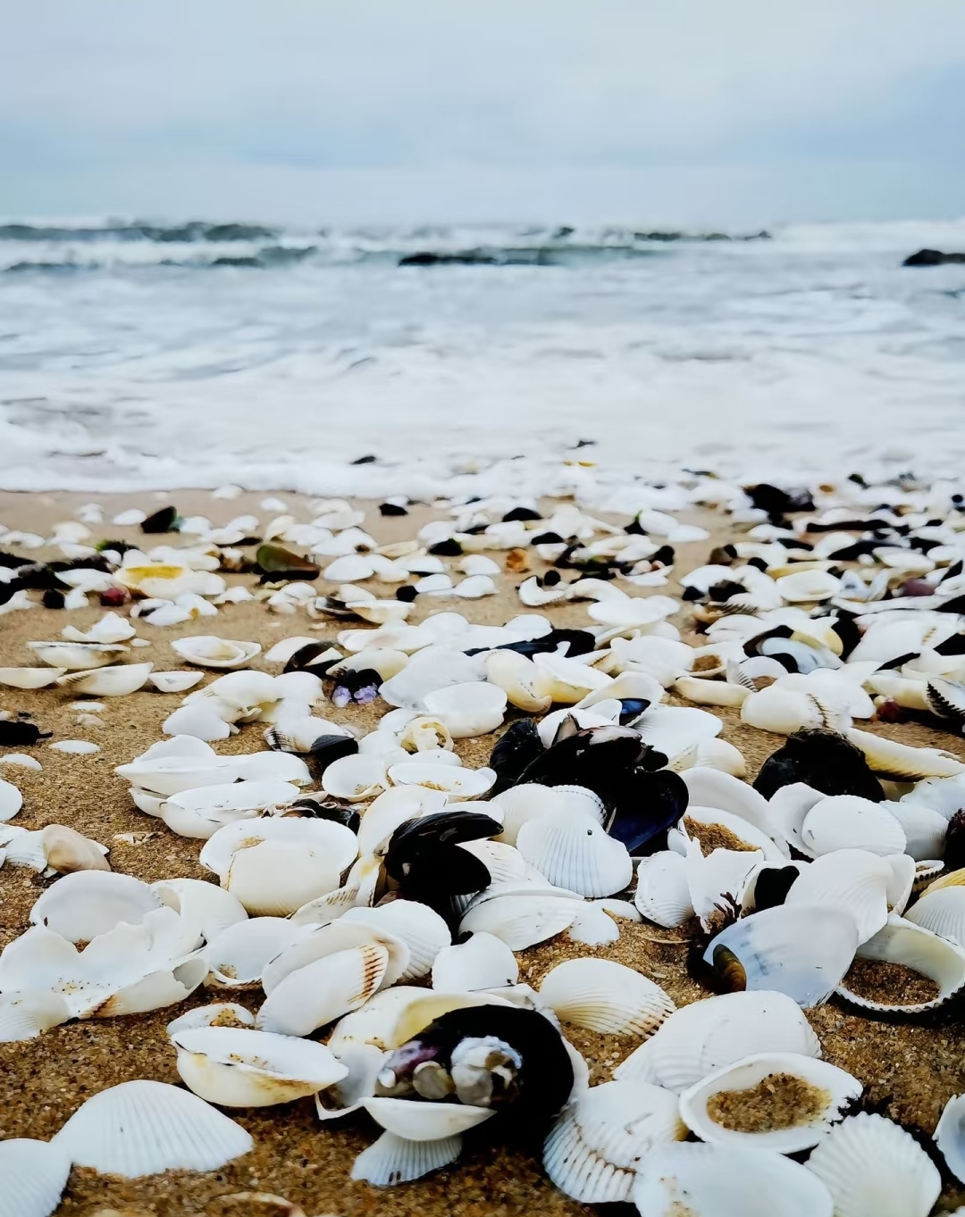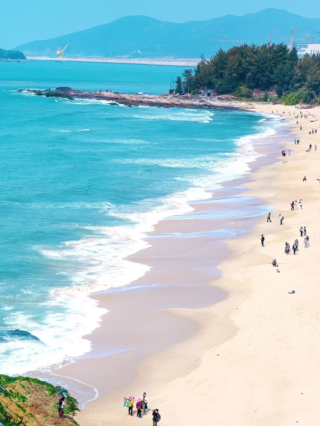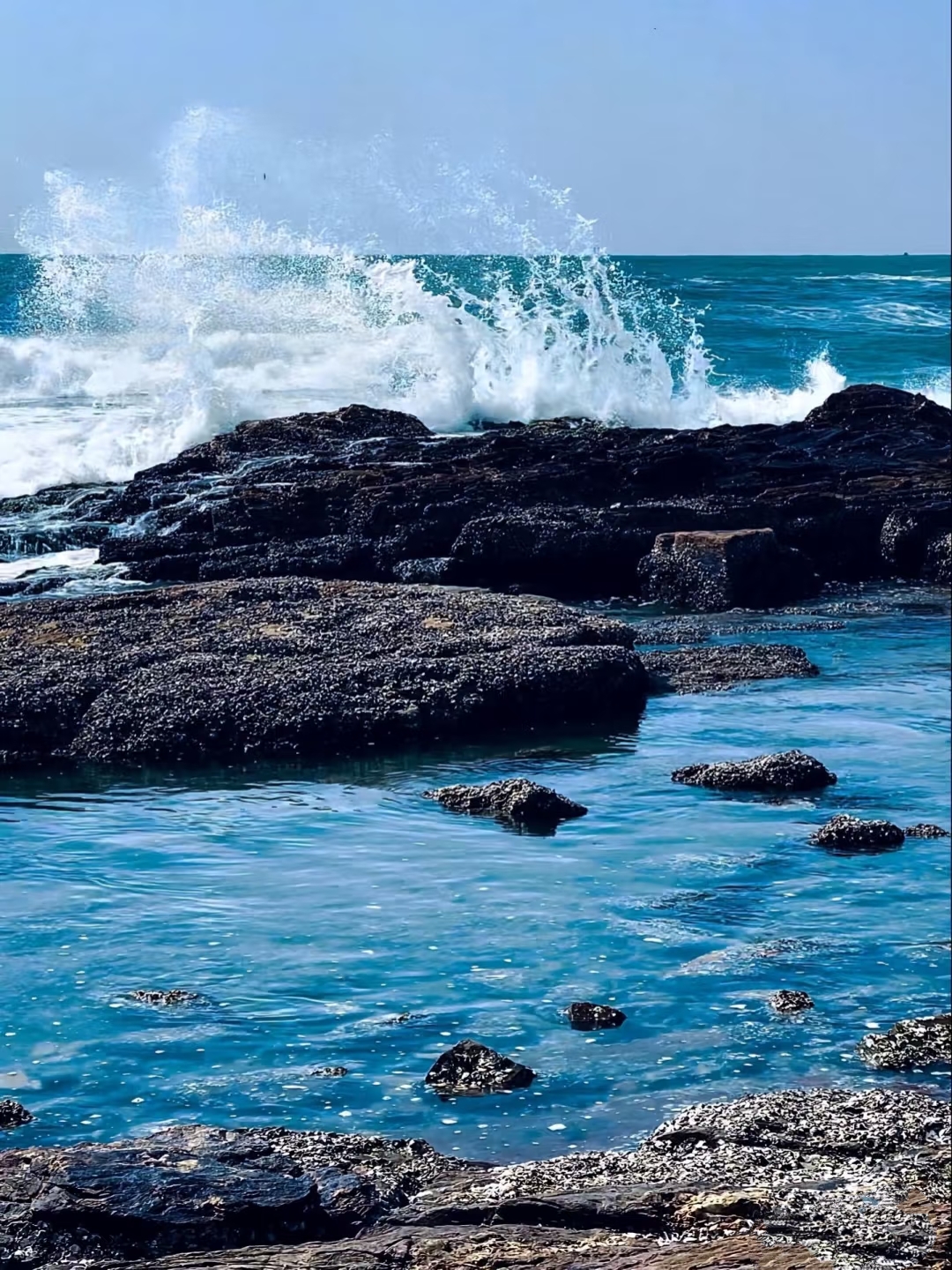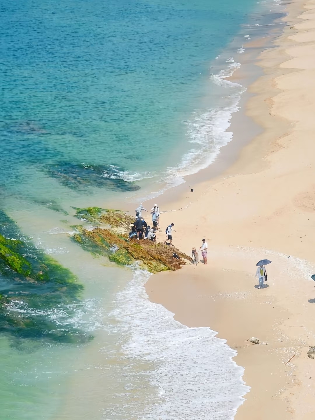 攀过几处低矮的礁石群,突然视野豁然开朗!杨屋沙滩的银白色浪花与黑礁石碰撞💥,潮汐在岩缝间奏响自然的交响乐。孩子们蹲在退潮的浅滩,寻找贝壳和小螃蟹🦀,笑声和海风一起飞远~