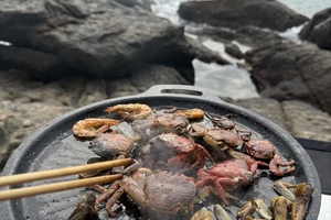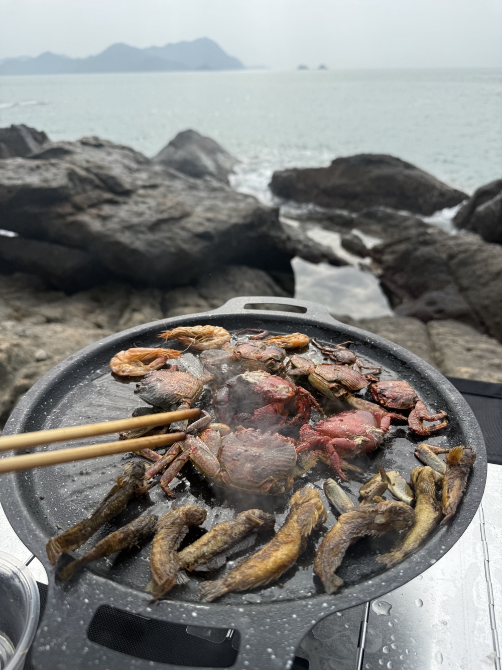 2️⃣ 海鲜自由盛宴:现捞螃蟹&海胆&小鱼直接放入烤盘|鸡汤暖胃🍲|快乐无限续杯🥤